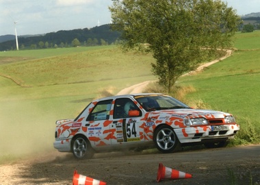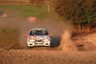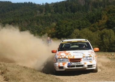 Die Abstimmung mit dem neuen Co lief von Anfang an gut, so daß die erste WP auf Platz 27 gesamt und Platz 4 bei den Youngtimern erfolgreich absolviert wurde. WP 2 mit Platz 26 noch einen Platz besser. Aber dann kam WP3, und das Team ging mit etwas Übermut in die erste Runde. Kuppe 100 in Rechts 2 minus führte zu einem unsanften Ausflug in den Notausgang geradeaus. Tiefe Löcher setzten dem Fahrwerk und Unterfahrschutz heftig zu, aber mit einem großen Bogen über die Wiese ging die Fahrt dann doch weiter. Der Cossie fuhr noch gut, aber die WP-Zeit war dahin. Platz 32, aber mindestens 15 Sekunden liegen gelassen. Platz 25 gesamt, aber nur 6. bei den Youngtimern zur Halbzeit.